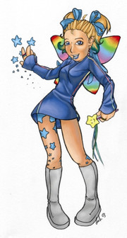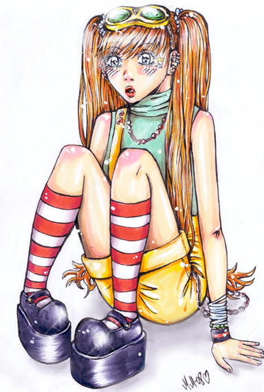 really nice piece. Those rainbow coloured things on her legs are very interesting...are they socks, pants, or extensions of her boots? great work.