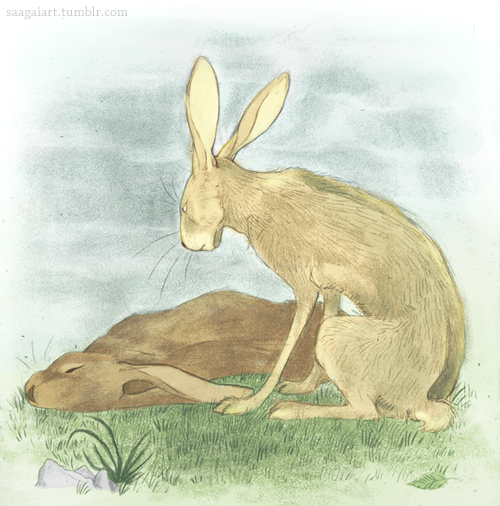 Heeey, i'm back. Sorry for being so quiet lately. I've been ill, but things are taking a turn for the better now.But yes, more hares to my gallery! Wanted to try how i would succeed drawing gloomy stuff without actually being unhappy. Cause, you know, it'd be nice to be able to make dark themed art without feeling miserable at the same time. After all, i do enjoy horror/dark art myself.