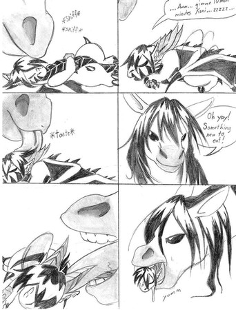 saber-th~"I think this is the best one I did..." Well, the most favourited one (currently) IS 'Cynder eats Ranger', with 254 favourites! Just thought I would add this fact in there. NICE^^
