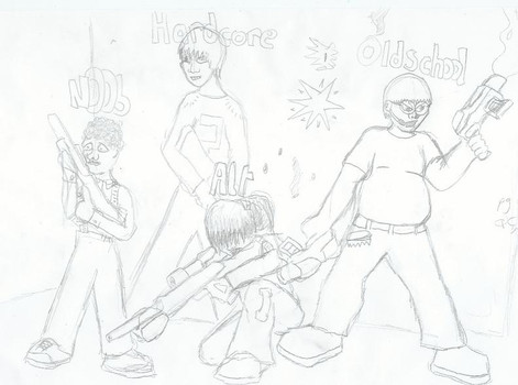 W00t! You got the 3D stuff up! And nice job developing the bodies too! Keep working at them, hopefully you'll get it right! But yeah, work on his back and the arms, try and get them more muscled. And as for textures, can't you create them in Painter and use them on there? *shrugs* Great work though!