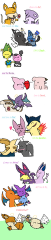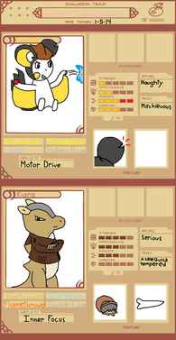Personality: Patchwork is a good soul, who is always trying to look on the good side of things. She is quiet, and doesn't really say much of what is on her mind, but she has a good outlook on life. She is quite smart and intelligent when it comes to grammar and numbers. But when it comes to actual social interaction... She is quite quiet, odd, quirky, and maybe even the tiniest bit awkward. it is quite easy to hurt her feelings, and she is quite the crybaby. But she is quite odd when it comes to her crying, and she often jumps between tears and smiles quite easily, never really caring about sadness too long. At times she can be quite careless or rash, maybe even the tiniest bit stupid. She appreciates the small things in life, and is an observer, almost always stopping to look at things. She is a bit shy, and is easy scared. She is quite immature for her age, and often acts quite childish or clueless. She hates to fight; And is totally frail and weak. She is VERY creative, and is quite artistic (Or so she THINKS. XD). She is often quiet, and prefers peace and quiet; But if she truly trusts someone, she can really get into a conversation, and will talk for hours on end. She is TERRIFIED of Dark Types, and will often avoid them at ALL costs