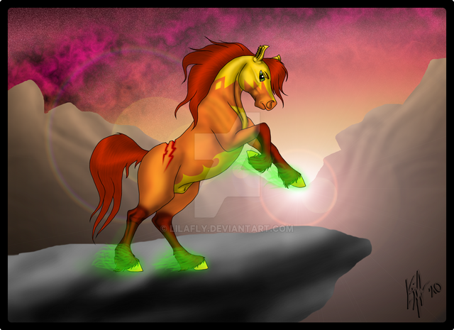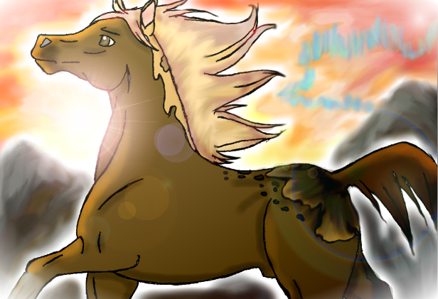 I'm loving the horse and the color scheme for it. I do however can't deny that that you're right about the background color. But i like that you didn't put him in a "realistic" setting with *gay background fiddle music plays* "green grass, pretty tree's, a lake and clear blue skys". I like the surealism you added to it by not doing that.