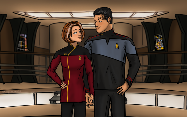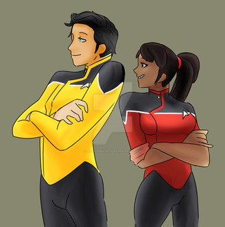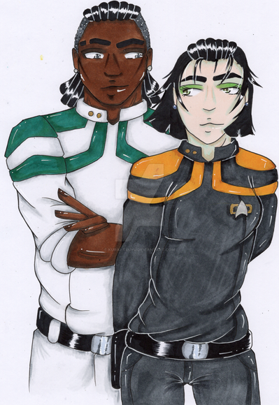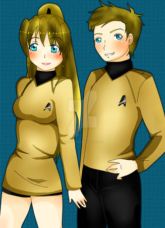 (Not sure why it's so grainy...I think something is wrong with my post processing on Photoshop, I'll try to fix it later!)Long overdue Commission for of His Captian OC with my Trek OC, Calius Kirk in his AWESOME fanmade Uniforms