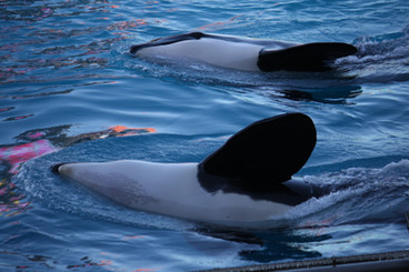 Its Laverne and Spinnaker swimming together in the animal care pool while the main tank is getting inspected for an item that fell into the pool durning the show.Spin's on the top and Larverne is under him.
