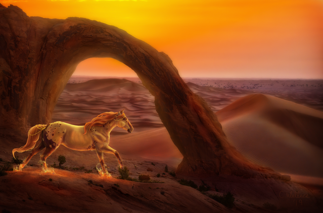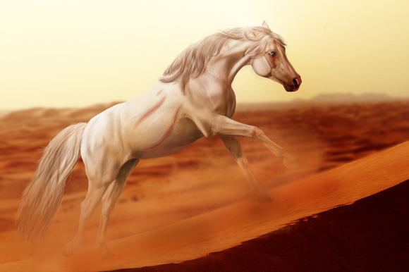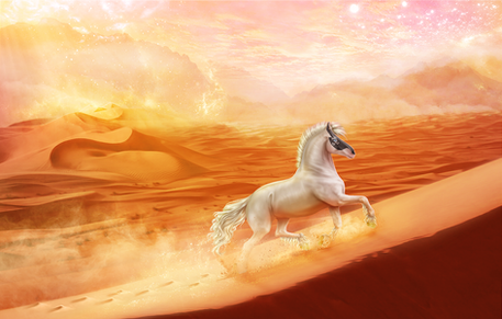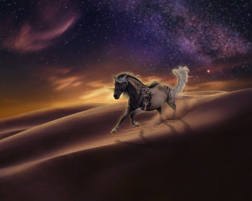 Q, taking to form of an Arabian Stallion, making his way toward the small nestled village to keep an eye on Calius :3