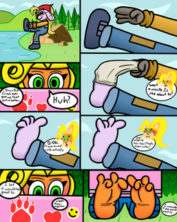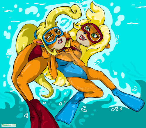 Coco and Tawna (from "Crash Bandicoot") have gone up on top of a high diving board to enjoy the view... but they slipped! Coco has fallen in the water after trying to hang on Tawna's stockings! But now, Tawna has lost her grip!!