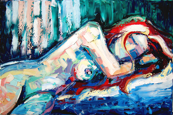 This painting in thick oil applied with a palette knife depicts a nude man and woman in a tender embrace.