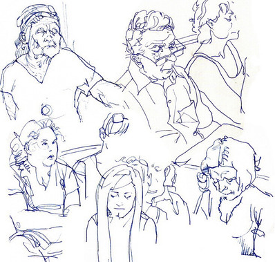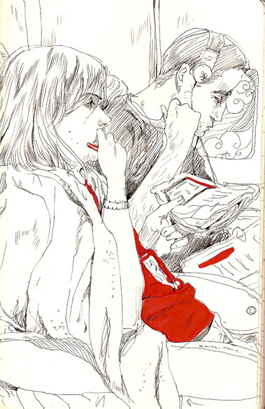 Ah, I love this series of sketches! I also tend do this when I'm on the train, or even the bus. And yes, the use of red was a nice touch