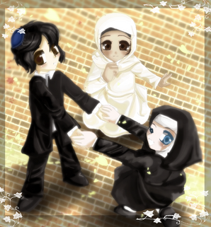 The girl with the 8 pointed star? It's Ba'hai, a religion that accepts all religions O_o; Someone who was Ba'hai requested this picture ^_^