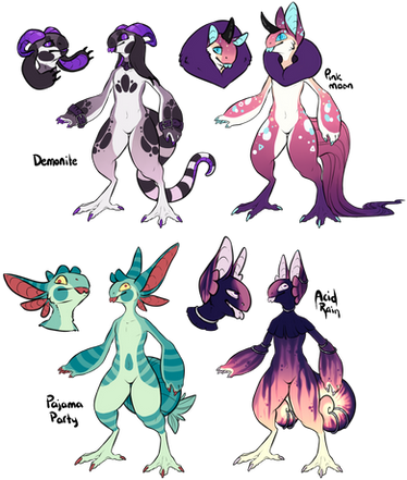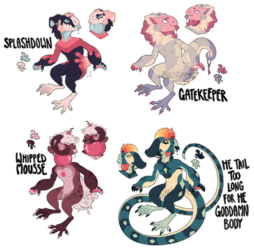 The last sheet! This just covers the Mutation trait, which is a huuUUUUGELY varying trait that basically themes the Cache Dragon with whatever they hoard. I've heard so many aMAZING ideas for this, and while I want to keep it from being a thing every Cache Dragon has, the MYO contest will be a special exception where I'll allow people to grab the trait under certain conditions, because I really love seeing what people come up with. ;w;The two children at the top (Taffy and Cotton) both belong to ClaribeIle , and are excellent examples of the potential of mutations! I couldn't help but use them in the sheet. ;w;