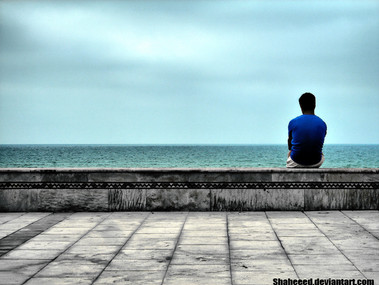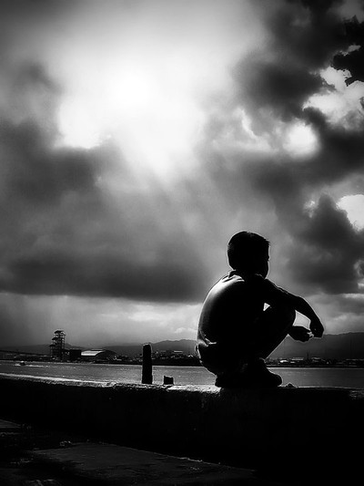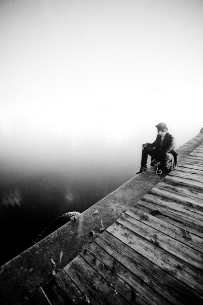 So much emotion by reading the body language: the slumped shoulders, head down, hands clasped...one can feel the despair. I really like the angles of the photo as well, the position of the stairs, and the horizon . This "minimalist" setting is got so much going on. Congratulations on your thought provoking and attention getting DD.