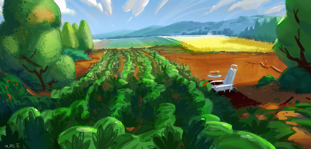 I really like the esthetic of it, but one thing is, my eyes goes straight to that shiny patch of grass in the FG and stays there. Maybe you could add something to attract the eye to the lower part of the painting