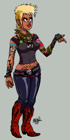 Awesome character you have there. I love the tattoos (the red skeleton arms are a neat touch) and the look in her eyes seem to say "I'm cool but I'm fully capable of kicking your ass." What an awesome name for a band, The Vomits.