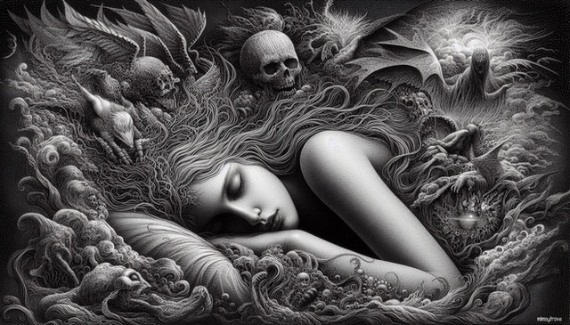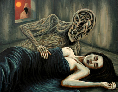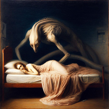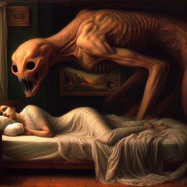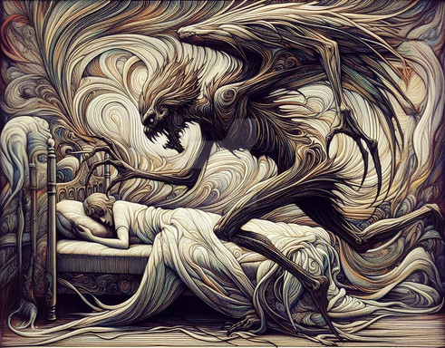 The woman in the painting is fast asleep, her face serene and relaxed. But lurking in the shadows at the foot of her bed is a demonic creature, its eyes glowing red and its fangs bared. It is a sleep paralysis demon, and it is waiting for the perfect moment to strike.