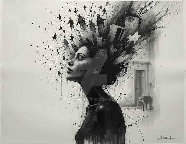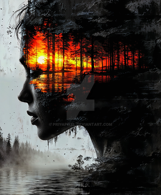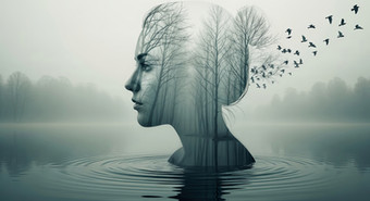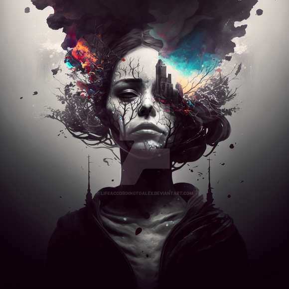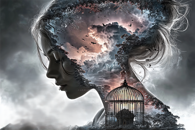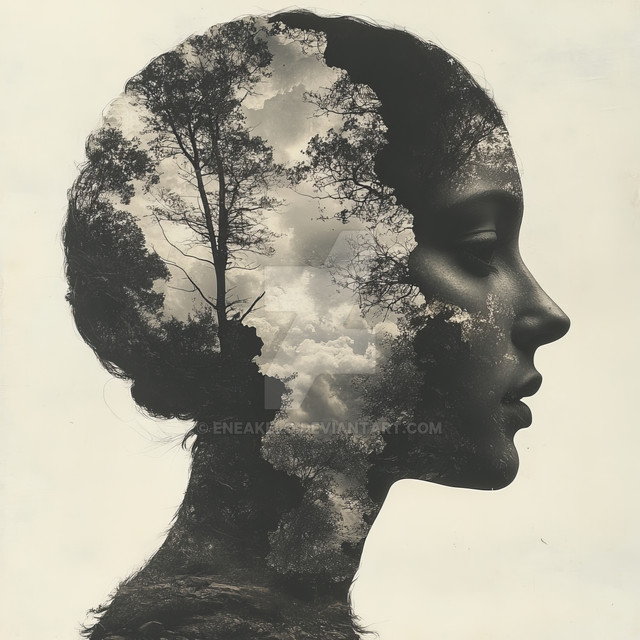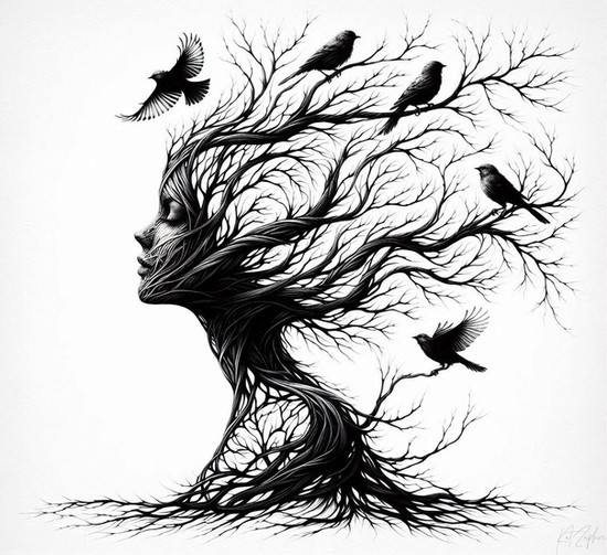 #surreal #digitalart #adoptable #birds #branches #connection #metaphor #monochrome #nature #profile #transformation #tree #woman #aiart
