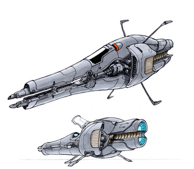 The Lighted Engine/reactors (?) at the back of the ship are a rather nice touch. Due to the arms attached to the glowing sections I imagined the devices swinging outward on the mounting arms for Hyperspace, or some other form Faster Than light prpulsion.