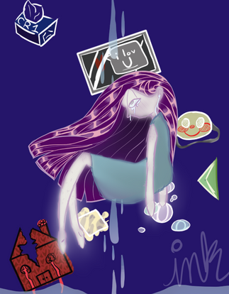I love the different paterns of her 'hair', how everythng is drawn in different shades of this dull aqua color (ff i dont know what it's called), and it'sjust owight adorably sad and cute.