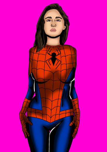 Overall fantastic job! One thing that stood out to me is that you have her posed like she's flying through the air shooting a web, but her hair is totally motionless. I'd expect it to look a bit more windswept if she had as much forward momentum as the drawing seems to be implying.