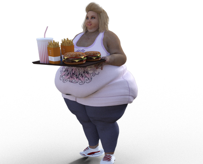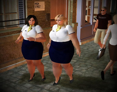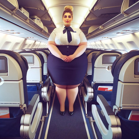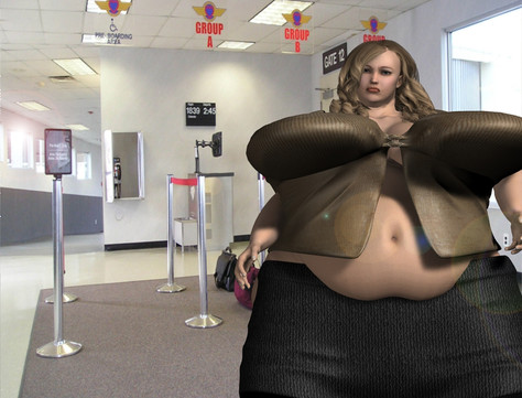 At the gate Kristal was struggling to keep pace. Normally two members of staff worked the gates but with the sand storm four Issa Express flights arrived at once. So she was solo. Normally Kristal stayed parked behind the console but working alone she was going to have to welcome the arriving flight as well. Her XXL uniform was took tight which combined with her thick, fat thighs made her wiggle waddle around the gate ponderous. She'd ballooned so big that it was hard to move fast. Waddling down the sky bridge to welcome the arriving passengers she had to put her hand on her distant belly to steady as it bounced up and down with each step. Eventually she arrived at the door of the Shuttlestar and fixed her best smile for the arriving passengers. They shuffled past; more than one checking out the bloated eye candy on display.