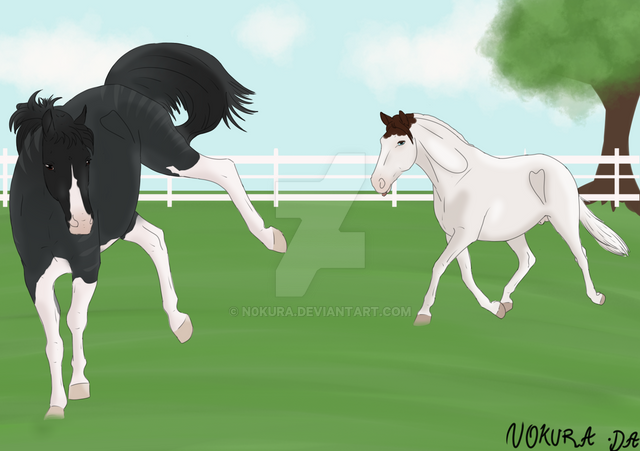 This is just great. Aztec comes prancing into the field all excited and content. Then throws on the breaks when he realizes a not-so-friendly mare is waiting for him. I can just imagine Arisu being all "-snort- I'm more of a stallion than you are!" and chasing the poor dear around and bullying him for a bit before actually allowing the breeding to occur. I am amused.