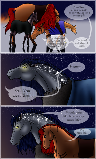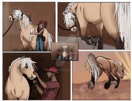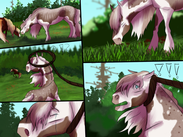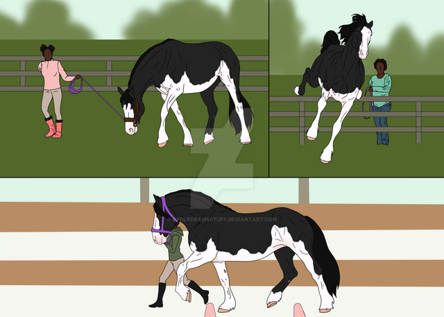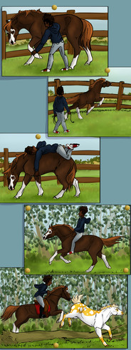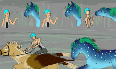 "Look i need a pony and i chose him and if he doesn't like it then hes gonna have to deal with it. you get the point." Areill demanded. Ueiss looked back at the strange little girl. He seemed rather indifferent to it all. Really indifferent as he let out a heavy sigh as he started to graze. Zaos looked at them and blinked a few time. "Despite the other two and considering where hes from hes really different." Zaos spoke to mostly himself. "But Aerill you cant-" "let her.. Its about time she work for her bored here." Alok spoke softly as he approached Them. Zaos looked to him quickly. "Are you sure?" He asked. Alok looked to Aerill and Ueiss. "Sometimes the horse chooses the rider. And by his reaction i think hes fine with the chosen rider." Alok said as he bowed slightly and walked off. Zaos watched him leave for a moment before turning back to Aerill. "How did you get up on him anyway?" He asked curious seeing as Ueiss is over 18 hands. She looked down at him. "Not telling. gimme the lead line." She said snoodily as she held her hand out. Zaos was a little hesitant to give her the line seeing as the stallion could still be unpredictable but faith must be with them. "Careful and be easy.." He spoke softly as he handed her the lead line. "Ya ya." She mumbled. Zaos gave her a look. "You get the point.." she mumbled more as she leaned forward and pet Ueiss' neck. "Its you and me now boy." She whispered to him. He glanced back at her for a moment then continued eating, almost in a more calm at ease way, feeling content about this place.