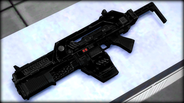 The Firehawk Industries MR-1 Revolving Rail Rifle, more commonly known as the "Triple R", is the company's top of the line rifle when it comes to distance, accuracy, and intimidation factor. The Triple R utilizes an old western concept of a rifle that functioned like an revolver. However, rather than firing small calibers like .357, .44, .45-70, the Triple R fires a unique .308 rifle round that is assisted through the weapon via an electromagnetic rail that sits on top and underneath the barrel. The revolver cylinder that sits just behind the breach holds a total of 6 rounds and functions as a dual action system, meaning no need to constantly cock the hammer for each shot and increasing the user's rate of fire.On top of the Triple R's insulated rail resides a sophisticated multi-spectrum (including two types of thermal imaging, and night vision), variable zoom, target tracking enhanced ballistic sight perfect for both medium and long range encounters. Also on board the rifle's chassis is an internal charging mechanism with a bank of 6 external capacitors that allows for rapid complete charging of the on board rail system that allows the operator to fire a shot every 1.5 seconds, allowing for all 6 shots to be discharged in a total of 9 seconds.