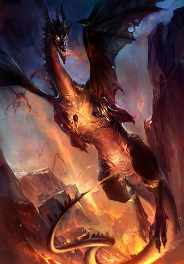 Greate Fire Dragon: These monsters are far less agressive than there younger (and smaler) counterparts. They became less like fire and more like lava. Slow but nearly impossible to stop. But that doesn't mean that the flame of there younger days is long gone. Angry greate fire dragons fight with a heat like the sun itself and usualy go completly berserc in fights.There powers over heat and fire have grown so much, that there mere presents turnts the land into an apocalyptic kindom of fire and lava. Mountainlike volcainos, seas of lava and even meteorimpacts have decemated whatever land this was before its arrival.