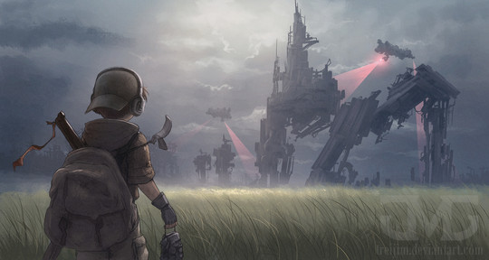 That thing is so creepy to watch it move. D: But this painting is lovely! I adore the contrast of nature all over all this cold machinery.