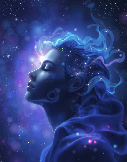 Wow... it's beautiful. Love the colour scheme and the mood, it's like the light is ideas or thoughts flowing out of her mind; the background looks like outer space, so for me it looks as though her thoughts are endless, flowing in a beautiful way