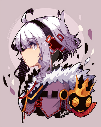 I already loved the sketch version of it but it looks even more awesome in colour. All those details and the shading look stunning and one thing I really like - although they're kept very simple and effectless - are her eyes. And the perspective along with the dynamic pose make looking at this especially enjoyable! >v<
