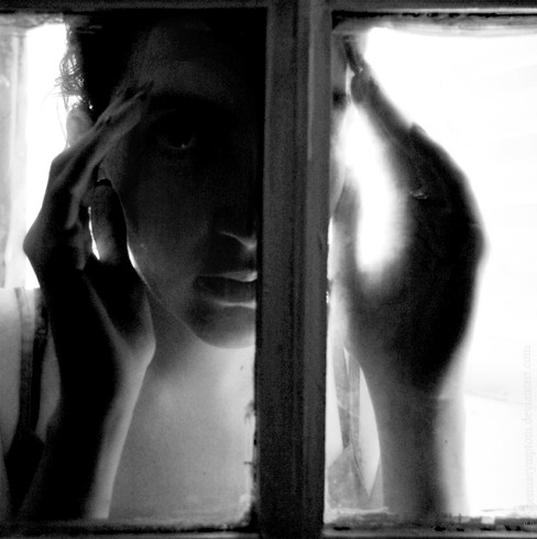 I have to agree with Mountaintrout ... this is a great work of art. It is well posed, well treated and framed. Your eyes blaze like fire through the window. However, if I saw someone looking out a window at me like this, it would be rather unnerving or if someone was knocking on my door and looking in ... I may run ... LOL.