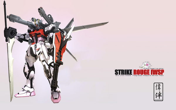 So this is the Strike Rouge from the Gundam Seed/Destiny anime/manga. The IWSP is an integrated weapons systems backpack that takes the AILE/SWORD/LAUNCHER striker packs and jams them into one convenient pack. It's worth noting that this pack's design (as well as the Gundam) eventually evolves into the Strike Noir from the STARGAZER mini series.