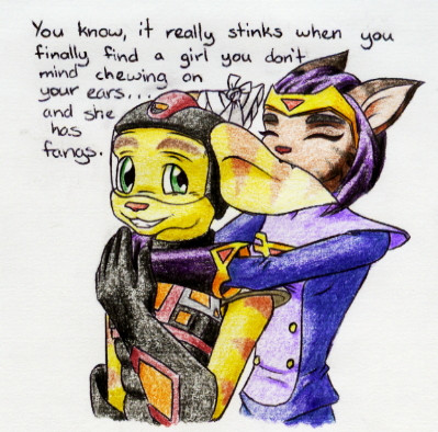 Her butt bugs me. So does Ratchet's, though I think Ratchet's hips always bug me a little in my pics. And her tail seems long. *mumbles about short tails* And, as always, all mechanical things pwn me badly. I think the engine's a little bare or something. Cars always have so many parts and wires to confuse you; a spaceship ought to have a lot more, right? Blame my laziness for not drawing them all in.