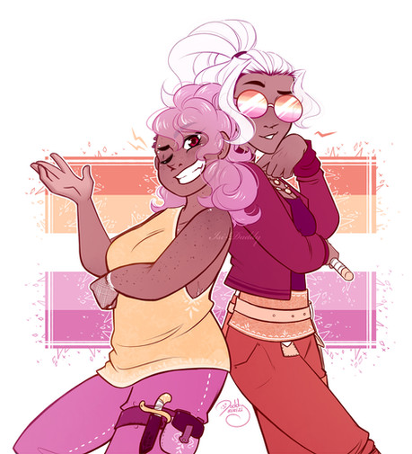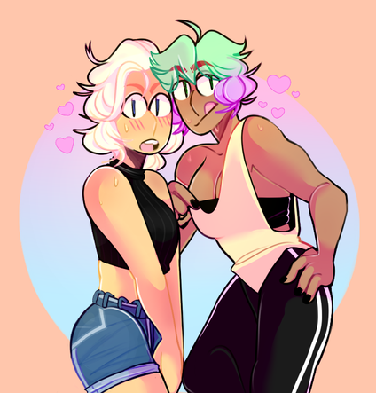 from the prestigious diamond academy - peridot, the stressed out engineer in the yellow house, and jasper, the buff jock in the pink housefor the jaspidot zine hosted by !! i had a lot of fun drawing these gfs, and the zine came together really nicely