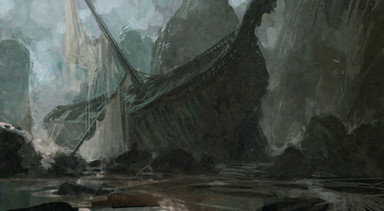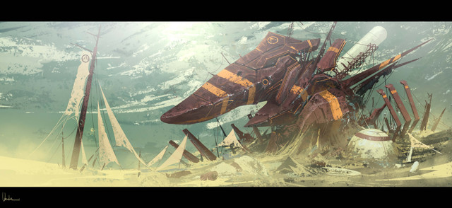All is calm, the desert sun is high. The sailing vessel stands upright in a vast wasteland.