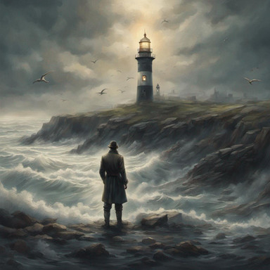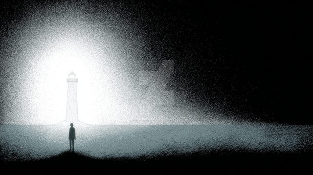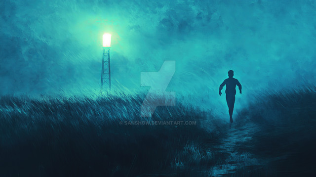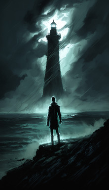 #fantasyart #digitalart #digitalpainting #surreal #wallart #portrait #horror #sky #sea #contrast #determination #escape #guidance #hope #lighthouse #mystery #painterly #perseverance #silhouette #solitude #urgency #bright_light #night_scene #dramatic_lighting #rugged_terrain #man_running #moody_shadows #textured_style #glowing_beacon #journey_forward