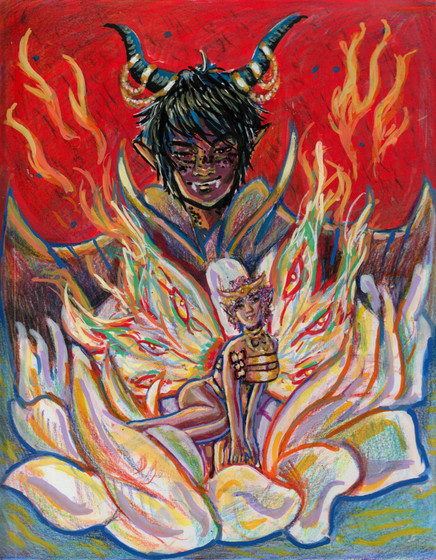 A drawing of my OC, Kaizen, as he flees his burning hometown.Finished on January 25th, 2016