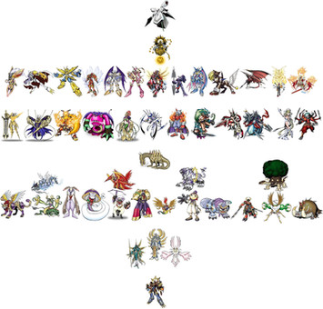 Under Patamon we have Lucemon with Meicoomon's child stage on his right shoulder and Plotmon (Salamon) on his left. Just below them, left to right are: Meicoomon's baby stage, Tokomon and Nyaromon. Below them is Poyomon and then left to right is Puttimon, Cupimon and YukimiBotamon (SnowBotamon)