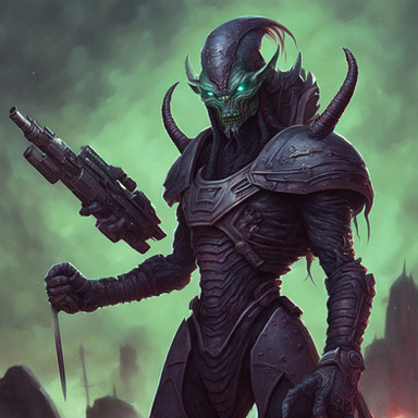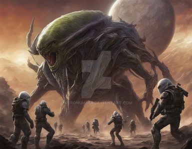 A small pause, a small darkness. Then she noticed a shadow standing over her. Slowly she opened her eyes again. The first thing she noticed was the bright moon appearing behind her rescuer. Only then she notice the Marine standing directly in front of it, then the heavily tan armor, the flashy high-tech shoulder armor to his right, the elongated beast-like helmet, the tainted and freshly used Gauss rifle, and last but not least the spiky back that literally encircled the moon behind him. And then it dawned on Lera that before her stood not a Marine, but what must once have been a Marine. And finally she remembered something else. There is no moon on Cavir.