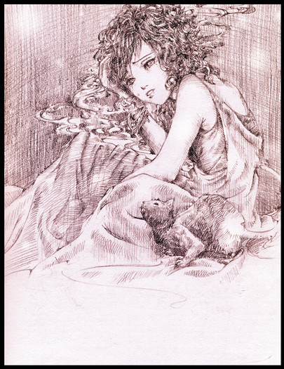 I'm amazed at how clean you keep your art! Especially, because it was done in pencil. I have a hard time trying not to smudge parts of the drawing, hah. Lovely work, maybe draw her sort of leaning of the paw, falling asleep. Sort of like this [link] hope that helps and good luck (: