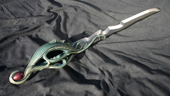 A new prop! Made from wood, fake plants, and cast resin I carved myself. Technical note: if you have resin you have sanded down and can't get all the scratches out, a layer of light colored wood stain fills the scratches incredibly well. Wait to dry and seal with spray fixative and it's amazingly smooth. No joke. The picture does not do it justice how perfectly translucent that blade is. Amazing.Took a few hours. The handle took the longest because i had to carve and paint/stain it a few times to make it look right.
