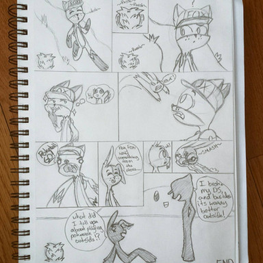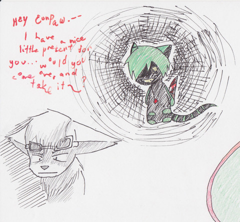 Spade's in a field and track championship finals, and he's determined to win, as is his opponent. (those are prescription goggles, btw; he can't see a thing without them (literally, everything would be blobs of color. Like when you splat green on canvas and say its a leprechaun.)) They get to the last leg, but then... Spade gets hit in the face by a flying piece of paper! no longer able to see, he trips on a rock and rolls past the finish line, whereupon his teammates are joyous and throw him in the air. That last panel is just a close-up of the invitation in his paw.
