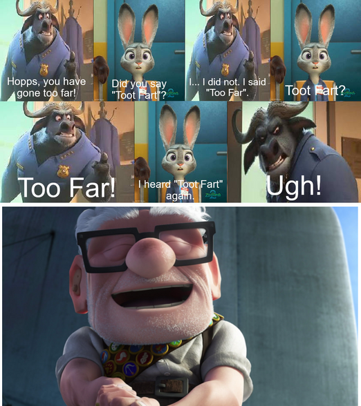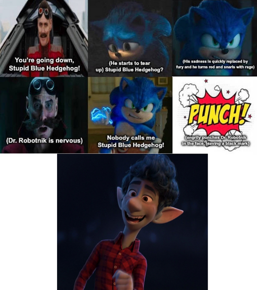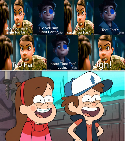 This meme contains pictures of Iandore “Ian” and Barley Lightfoot (Onward (2020)) are getting very angry, mad, mean, rude, disrespectful, disloyal, unhappy, and unkind about the ending scene for the 1955 “Looney Tunes” short film that was directed by Chuck Jones, “Rabbit Rampage” with the cartoon character, Elmer Fudd (who appears as a cameo at the end of “Rabbit Rampage” (1955)) because Ian, Barley, and many popular culture fans are not happy about seeing Elmer Fudd winning over Bugs Bunny in some “Looney Tunes” and “Merrie Melodies” cartoons, including “Hare Brush” (1955) and “Rabbit Rampage” (1955) at all.This meme is from CartoonAnimeFan2000