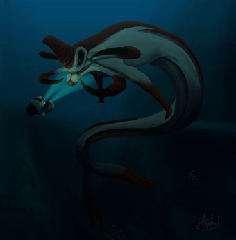 The Reaper Leviathan from the game Subnautica. I argue that these are scarier than other leviathans because of their horrifying sound and the tendency to appear out of nowhere.Related content