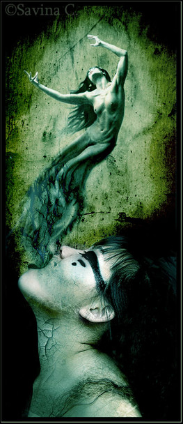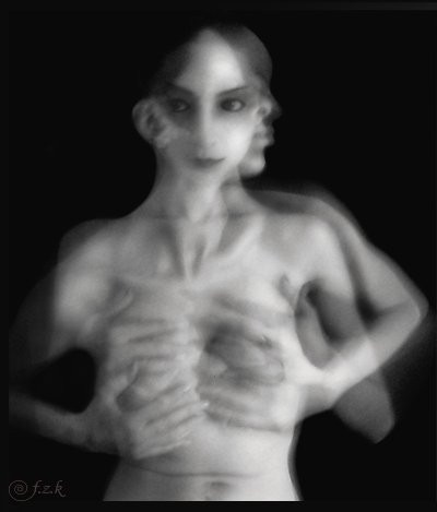 In the forward image of whomever that is, the blur makes a fine distortion of the face that I think emphasizes the out of body experience.