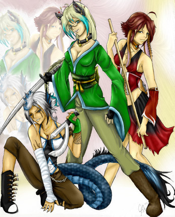 Hehe, I'm glad you like it ^________^d It was fun drawing all the characters, espcially Iris's hair ^.^ I wasn't sure if I should have added the horn or not, but I figured since Sayda was sporting her horns and scales, Irisi might as well have a horn too c___c;; That's my logic for ya X3 Ah well, August babies are the best :3