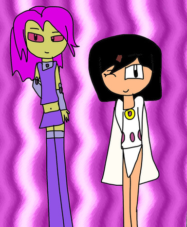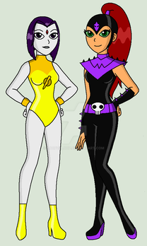 Alright, the pic for today. Since Raven has those powerful legs, I was thinking of some attire for Starfire since in the comics her cleavage is mostly shown, and to give her a similar outfit to Lady Legasus'. Now Raven has a partner. XD
