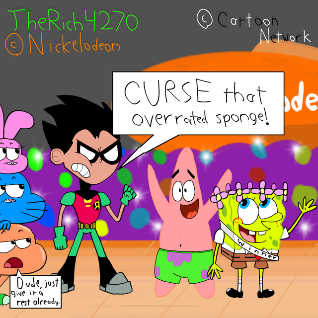 Robin, we all know very well that Spongebob is not overrated, you copied him, and he will be around until Nickelodeon gets shut down. XD