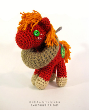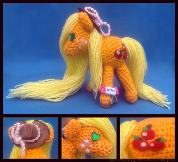 Applejack, the second character of the Mane Six from My Little Pony: Friendship is Magic.Made with acrylic yarn, plastic buttons, felt, thread and polyester stuffing.