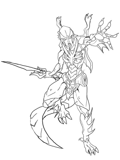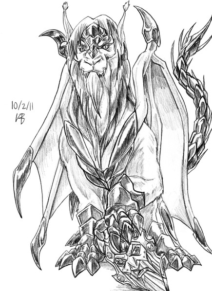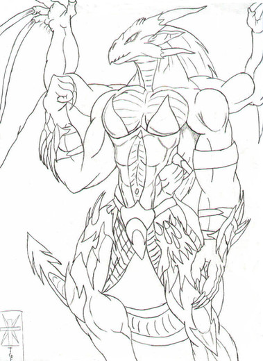 3) The half-dragon-heads hang freely off her back, but are fully manouverable, and are able to be attached to the arms and used as a melee weapon... the horns are very scythe like.